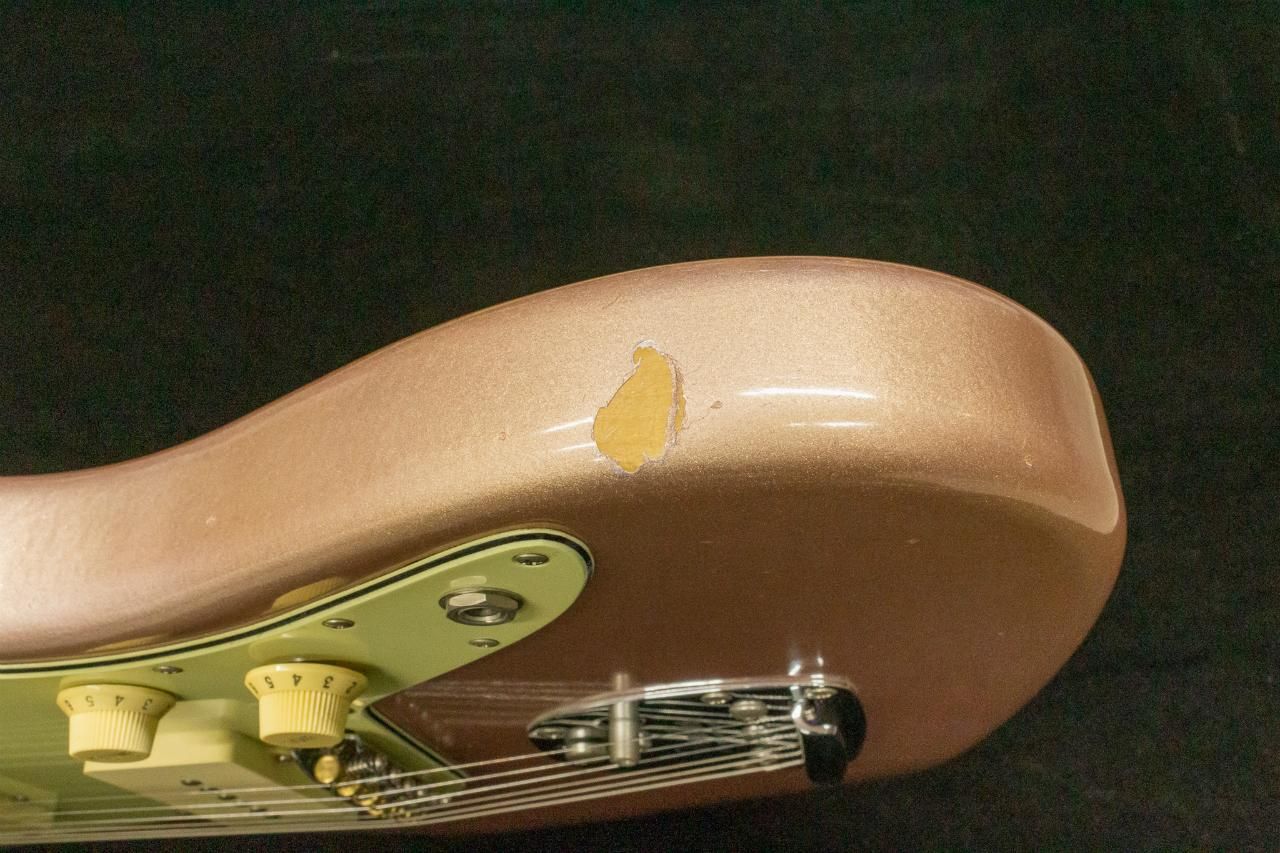 ジャック付近に25mm程の塗装欠け、ネックジョイント部に塗装割れとクラックあり、ピックガードに弾き傷あり、ヘッド部に打痕が数箇所あり、ピックアップカバーやけが有ります。