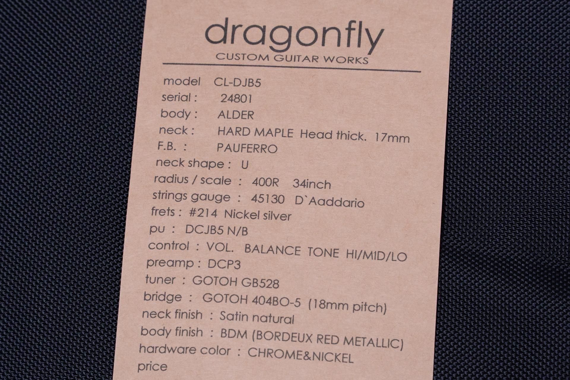 【new】dragonfly / CL-DJB5 ALD/PAU BDM/TO3 4.275kg #24801【GIB横浜】 送料無料 330,000円 3300 pt SOLD OUT 送料無料 330,000円 3300 pt SOLD OUT dragonflyは長い歴史をもつ日本のギター・ベースブランドです。 ミュージシャンと共に培った知見と技術を用い、高品質な製品を製造しています。 多くのミュージシャンに愛用され、Fear.and loathing in Las Vegasのテヤン・テツヤ氏などは長年同ブランドのベースを使用しています。 dragonflyにはいくつかのモデルがありますが、本モデルは新しく始まったクラシックなJBスタイルのCL-DJB5です。 シンプルにクオリティの高いJBで、いくつかの点をカスタムすることに対応しています。 こちらはdragonflyオリジナルのプリアンプを採用しています。 このオリジナルのプリアンプは実にナチュラルなキャラクターで、パッシブ + a を体現するかのよう。 Xoticあたりのプリアンプが好みの方には好まれるかと思います。 コントロールはボリューム、バランサー、トレブル、ミドル、ベース、プリアンプオンオフSWです。 ボディにはアルダー、指板にはパーフェロー。 トラディショナルな構成です。 サウンド面も良好で、シャープでパワフル、そしてクリアなサウンドが得られます。 現代において理想的なJBサウンドの1つかと思います。 dragonflyらしく、スムースな弾き心地も魅力的。 単純にクオリティが高く、5弦JBを探されている方には一度弾いてみて頂きたいシリーズですね。 SPECS body:ALDER neck: HARD MAPLE Head thick. 17mm F.B.:PAUFERRO neck shape:U Shape radius / scale:400R 34inch strings gauge:45130 D'Aaddario frets:#214 Nickel silver pickups:DCJB5 N/B control:VOL. BALANCE TONE HI/MID/LO preamp:DCP3 tuner:GOTOH GB528 bridge:GOTOH 404BO-5 (18mm pitch) neck finish:Satin natural body finish:BDM (BORDEUX RED METALLIC) hardware color:CHROME&NICKEL GIBの職人が演奏しやすく調整した上でお届けします。 付属品 : 純正ギグバッグ 文章 : 嵯峨駿介 検品担当 : 伊藤 商品写真 : 三浦 メーカー保証つき ◯GIB, TONIQ保証について ●メンテナンス 永久無料 当店でご購入いただいた楽器は、「弦振動に関するセットアップ」(通常4,400円)を永久に無料でご利用いただけます。(要予約) ・名前を記入した保証書のご提示をお願いします。 ・GIBとTONIQの実店舗・オンラインショップでご購入されたご本人のみが対象です。 ・送料などの諸経費はご負担頂くようお願いします。 ●再買取金額保証 ご購入後、6ヶ月以内にご購入品を手放す際には当店にて買取金額を保証いたします。金額は新品は50%、中古は70%です。 ●不良の保証 ベーシック株式会社が販売した商品は不良に対する保証を行います。委託品などの一部商品を除いてご購入から一定の保証期間中、正常な範囲内でのご使用にて発生した故障については無料での修理(不可能な場合に限り返品・返金)を行います。 保証期間は中古商品は3ヶ月、新品商品は1年です。 次の場合は保証期間内でも有償での対応となりますのでお気をつけください。 ・輸送、移動、落下等により生じた故障及び損害の場合。 ・消耗品を交換する場合。 ・火災、地震、塩害、ガス害、異常電圧による故障及び、損傷の場合。 ・取扱説明書に記載の注意事項に反するお取り扱いによって生じた故障、損害の場合。 ・弊社以外が修理、改造された部分が故障・損傷した場合。 ・保証書にお名前、モデル名、シリアルなどの記入がない場合。あるいは字句を書き換えられた場合。 ・保証書の提示がない場合、または紛失した場合。 (保証の提供は日本国内でのご購入に限ります) 頑丈な段ボール箱で発送します。 海外向けの発送にも対応します。 item will be packed with a hard cardboard box. we do ship internationally. 問い合わせ先 Contact Info LINE : vwj2699r email : info@bassick.jp TEL : 045 594 7308 送料無料 330,000円 3300 pt SOLD OUT GIB三ヶ月保証について(再買取金額・状態保証等) 分割支払いの金利無料条件について この商品について問い合わせる 送料無料(一部商品を除く) おすすめ商品 【new】ROSIÉ / ROSIE Ultralight Bass Guitar Case【ベース用】 27,500円 【new】GIB BASIC / THEギター専用蜜蝋ワックス COCO 15g【GIB横浜】 2,090円 【new】Baboon / THE ギター専用湿度調整剤 990円 【new】GIB BASIC / Neofit Strap Black【GIB横浜】 4,950円 関連商品 【new】GIB BASIC / THEギター専用蜜蝋ワックス COCO 15g【GIB横浜】 【new】ROSIÉ / ROSIE straps Black with Black Details 3.0inch【横浜店】 NEW ARRIVALS新着アイテム 【used】Fender / Engine Room LVL5 Power Supply【GIB横浜】 9,900円 【used】PreSonus / FADERPORT【GIB横浜】 12,100円 【new】Provision / VPB-GIB-RELIC-#003-J-ALD-3TS 3.920kg #25111811【GIB横浜】 517,000円 【used】SAMSON / MDA1 モノラル/アクティブDI【GIB横浜】 4,400円 【used】SolidGoldFX / Surf Rider ? Coral Pink【GIB横浜】 23,100円 【used】ZOOM / B2 Four【GIB横浜】 23,100円 【used】BOSS / LMB-3 Bass Limiter Enhancer 【GIB横浜】 7,700円 【used】ZOOM / B3【GIB横浜】 17,600円 【new】Kikuchi Guitars / Hermes M70-4 TWH 3.720kg #537【GIB横浜】 440,000円 【new】Kikuchi Guitars / Hermes M70-4 NAT 4.140kg #541【GIB横浜】 440,000円 【used】HISTORY / TH-BJ4/R WH 4.400kg #I060197【GIB横浜】 132,000円 【used】KLARK T