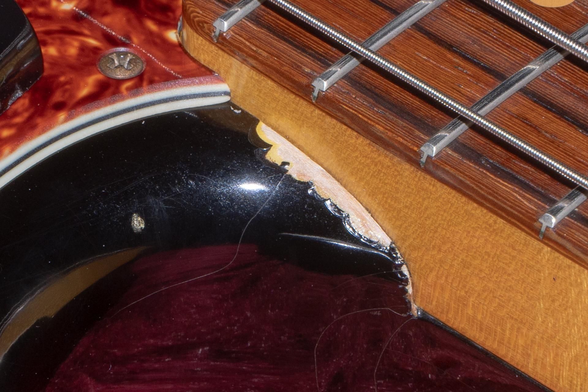 ボディや塗装面は、ネックポケット付近、ボディサイドの塗装割れやそのほか多くスクラッチ傷が散見され、使用感があります。